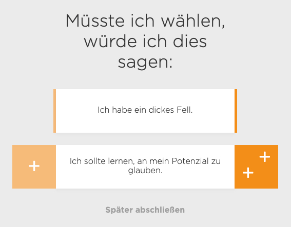 Für jede MyPrint®-Frage wird den Befragten ein Paar von Aussagen präsentiert, die sich auf Einstellungen, Gefühle oder Bedürfnisse in bestimmten Situationen beziehen. Sie müssen dann die Aussage wählen, die sie am besten repräsentiert. Wir erlauben ihnen aber auch anzugeben, in welchem Umfang diese Aussage besser zu ihnen passt.